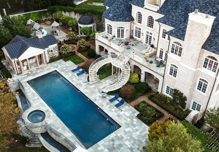 Other amenities throughout the mansion include a children's playroom, a gym, a wine cellar, and a tiered home theater. Outback, the property features a full outdoor kitchen, barbecue area, a dining area, a fire pit, a swimming pool, and a spa.